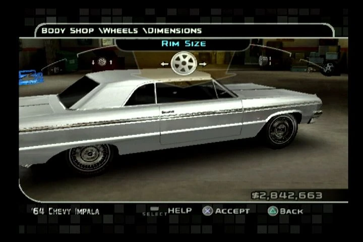 The Wheels part of the Body Shop is used to modify the wheels of the vehicle itself. It is separated into four other parts: Rims, Tires, Dimensions, and Rear Dimensions.