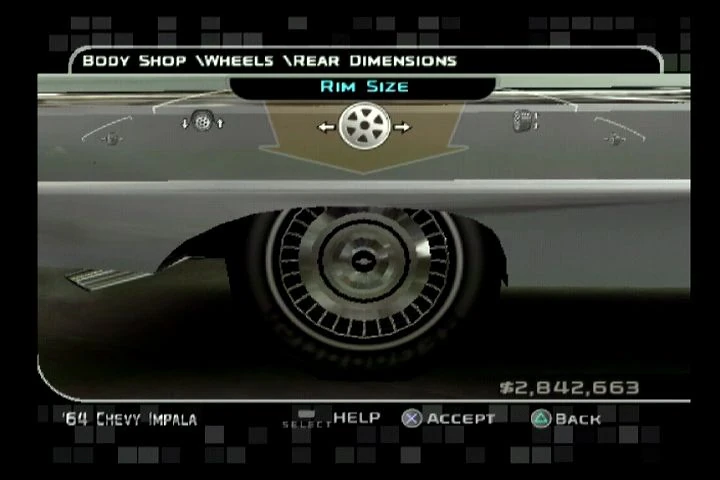 Rear Dimensions allows players to alter the rear wheels independently of the front. The same options as Dimensions are available in Rear Dimensions. However, the game will not allow players to make the rear end lower than the front or put smaller wheels than the front on rear.
