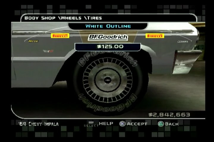 Tires mount on the rims of a vehicle. Here, you can only change the brand of the tire and the markings (letters, stripes). To change the performance level of the tire requires going to the Performance Shop.