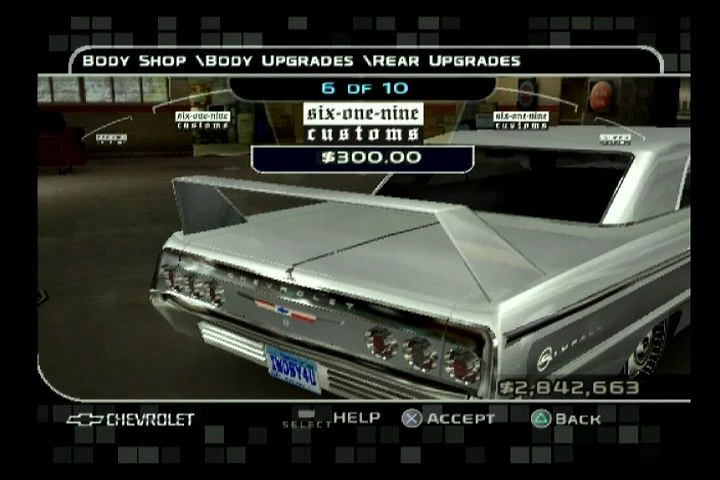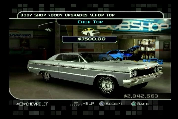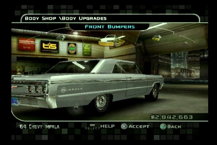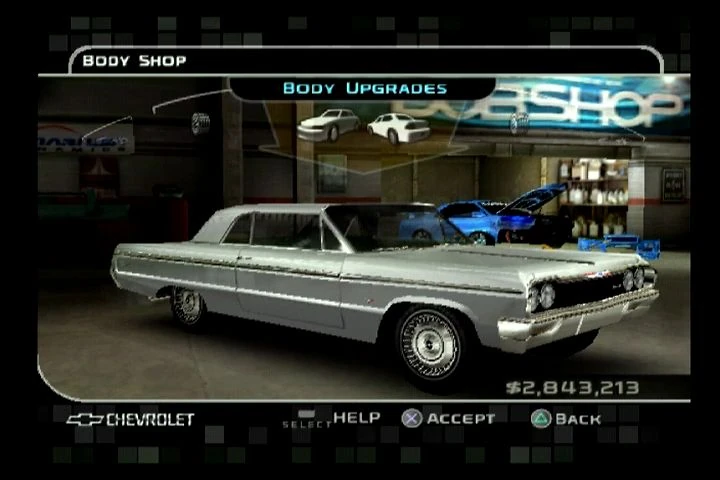 The Body Shop is a subsection of the Vehicle Modification system found in Midnight Club 3: DUB Edition. The Body Shop is where players can modify the physical appearance of their vehicles. The shop is normally divided into two parts: Body Upgrades and Wheels. However, the two parts are combined when modifying motorcycles and Body Upgrades are not present for Exotics and certain models in the other four vehicle types.