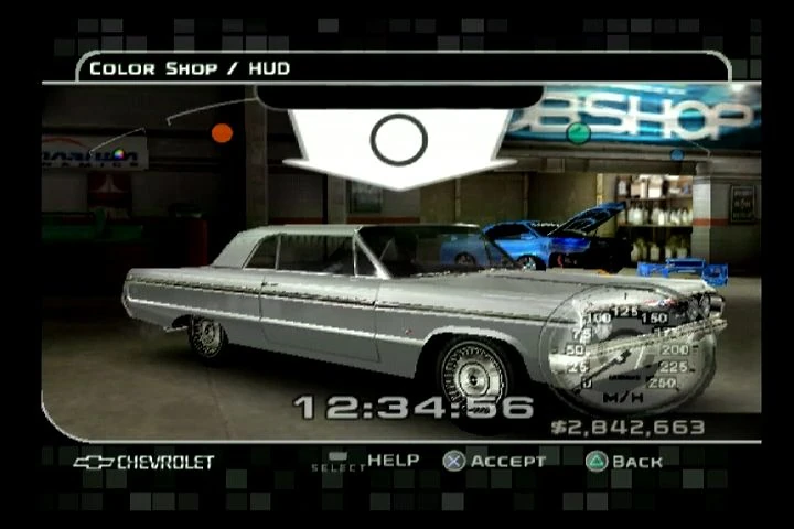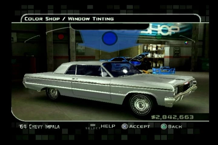 The Color Shop is a subsection of the Vehicle Modification system found in Midnight Club 3: DUB Edition. As the name suggests, the Color Shop is where players can alter the color of their vehicles. All sections of the Color Shop have a Custom color option to go with the preset colors.