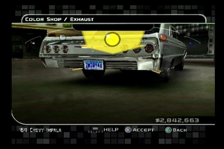 The Exhaust section allows players to recolor the vehicle's exhaust pipe and tip. An aftermarket exhaust is not required and a stock exhaust may be used. There are five preset colors (chrome, gold, copper, blue, brass) and a custom color option.