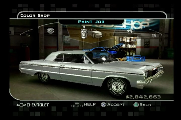 The Paint Job section allows players to change the color of the vehicle's body. The player may choose from five different types of paint, each of which has a number of preset colors. The preset colors are all free while the custom color options cost $1000 each. The paint types are: