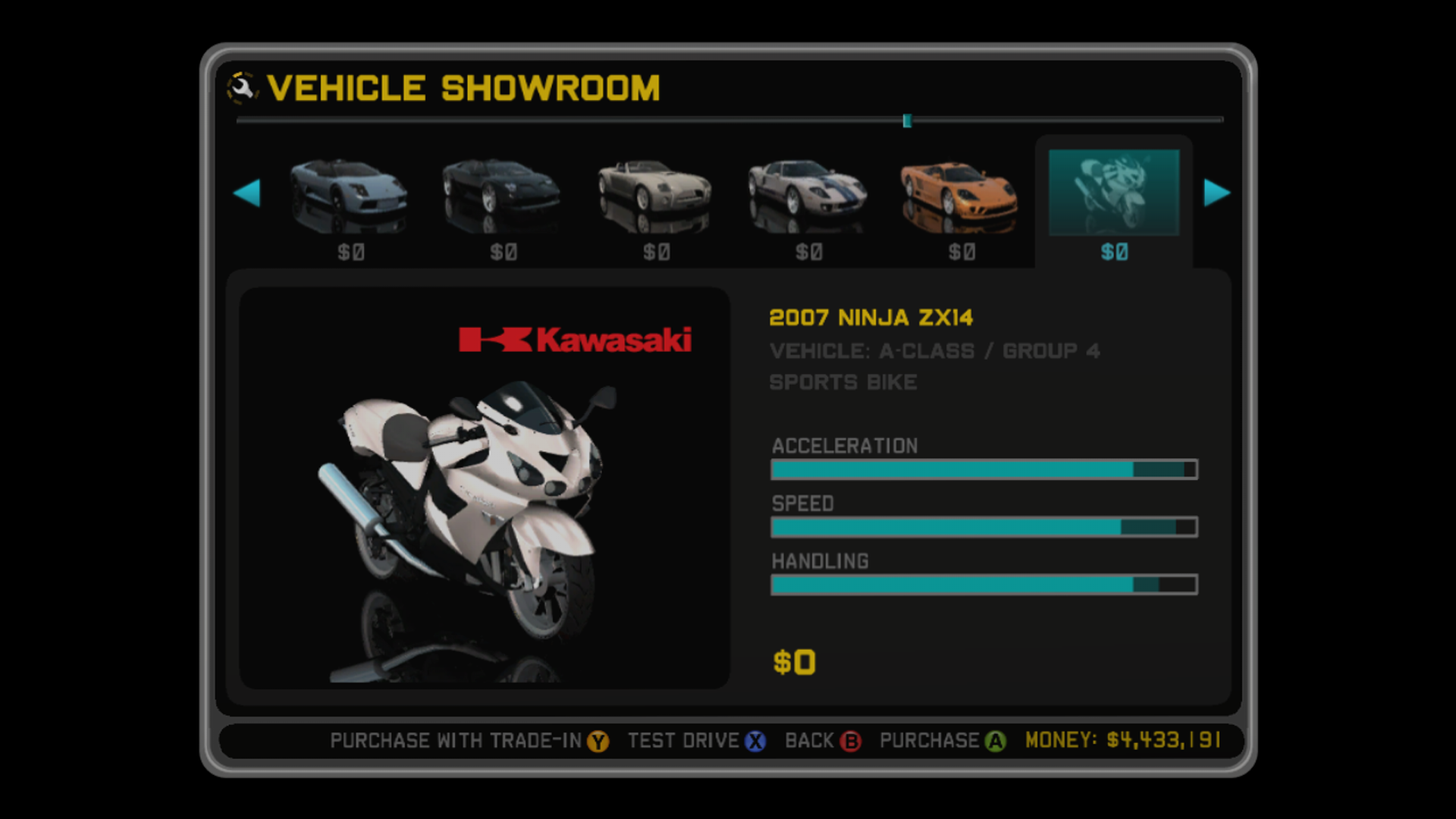 The Kawasaki Ninja ZX-14 is notoriously overpowered for it's low cost of $17,000. It has very fast acceleration and very responsive handling, especially when compared to the more expensive and high-end exotics such as the Lamborghini Murciélago Roadster and Saleen S7 Twin Turbo, especially with all level 2 upgrades, which was done to compensate for being tricky to master it's handling, having the lowest damage tolerance, and the player rider being bucked off every high speed hit, taking 5 seconds to remount after every crash.