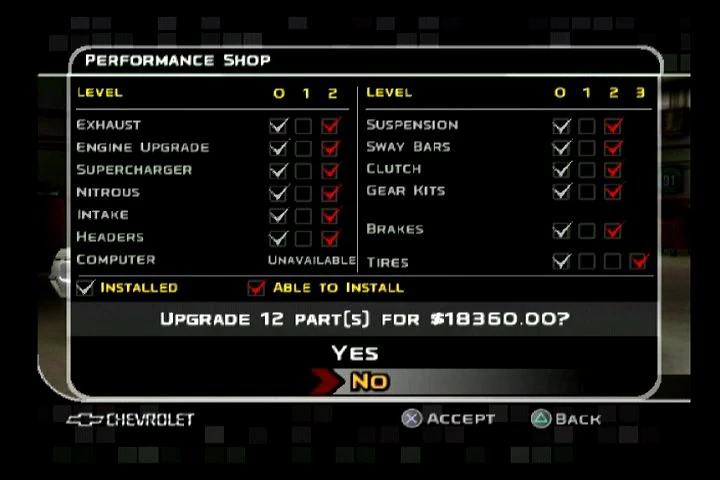 All parts can be upgraded from stock to two levels, except for tires which can be upgraded from stock to three levels. Players can also select a brand for each part. Different brands have no effect on the performance of these parts. Brands are the same between levels 1 and 2 except for tires and brakes. Tire brands are chosen in the Body Shop while brakes have one set of brands at level 1 and only Brembo at level 2.