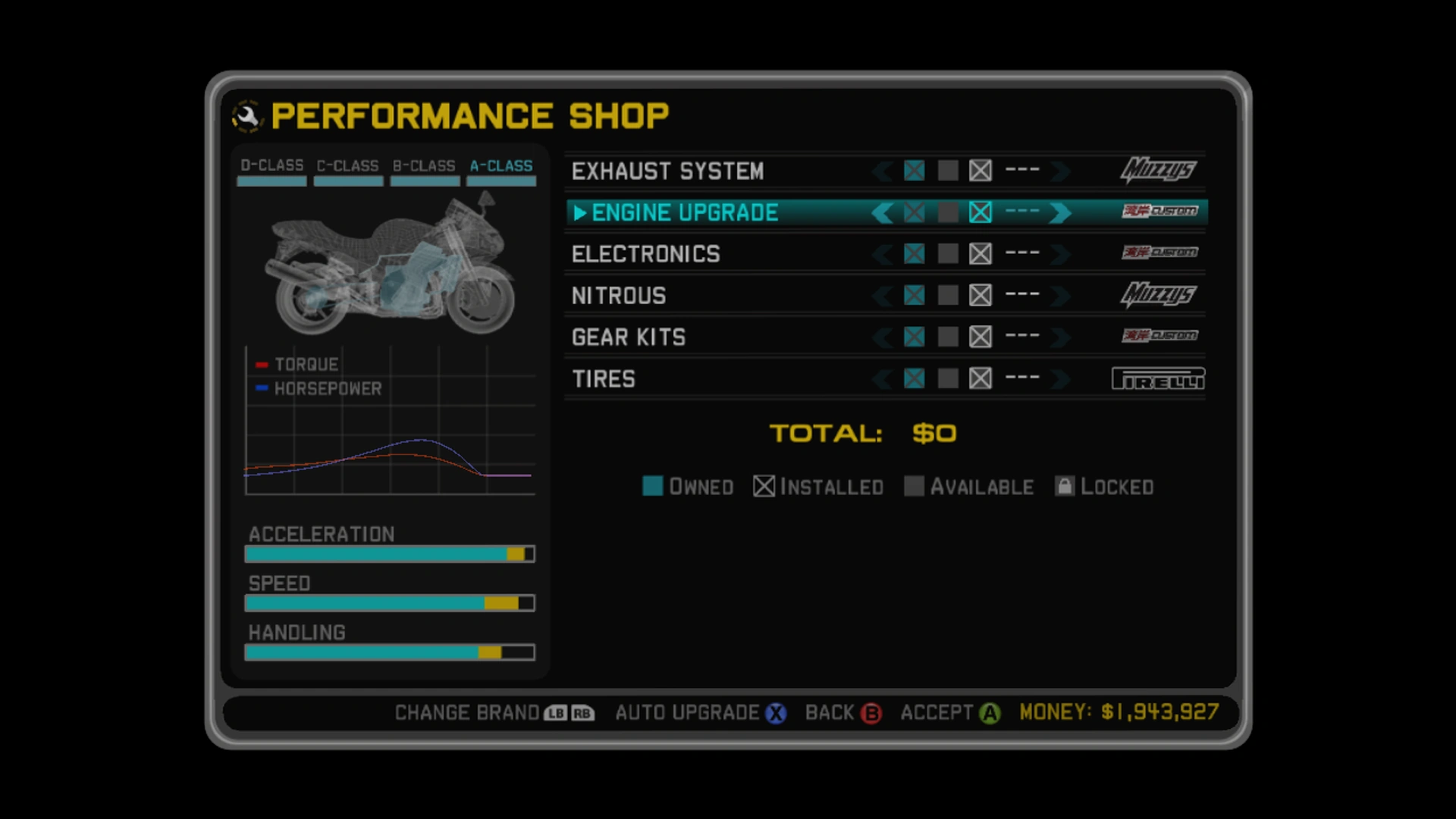 Motorcycles (Choppers and Sport Bikes) have a different set of performance parts from four-wheeled vehicles. Only Jet Kits (which are not available to car and trucks), Exhaust, Engine Upgrade, and Nitrous upgrades are available. They also only have the same nitro capacity as the Class D vehicles.
